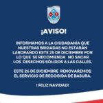 24 diciembre, 2025Informamos que este 25 de diciembre nuestras brigadas no estarán laborando, por lo que recomendamos no sacar los desechos sólidos...